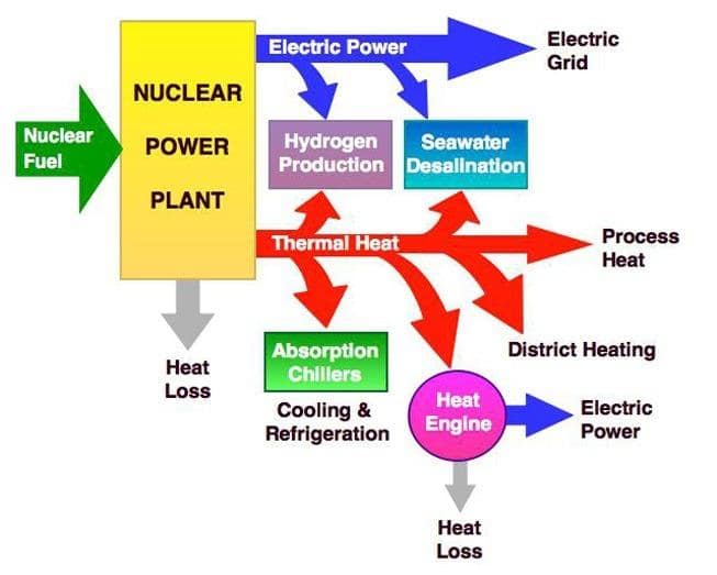 Assenza di emissioni inquinanti a parte, una centrale nucleare non funziona in modo molto differente da una qualsiasi centrale termoelettrica: cui il calore prodotto dalla reazione nucleare genera vapore che a sua volta aziona le turbine per la generazione di energia elettrica. Questo processo ha un efficienza abbastanza limitata (tra il 30% e il 40%), per cui non tutto il calore generato viene convertito in energia elettrica.