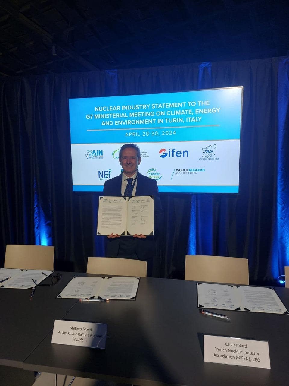 La dichiarazione è stata consegnata ieri dal Presidente di AIN, a nome di tutte le associazioni nucleari firmatarie, al Ministro Pichetto Fratin in qualità di Presidente del G7 per Clima, Energia e Ambiente.