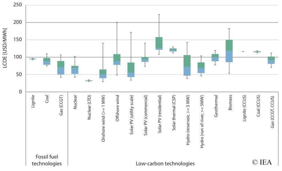 Anche il nucleare mostra costi in calo rispetto al 2015, almeno per quanto riguarda le nuove costruzioni di concetti NOAK (nth-of-a-kind), vale a dire di design già collaudati. Si conferma anche in questo caso la variabilità regionale (si va da LCOE pari a 48$/MWh in India ad 87$/MWh in Giappone).
