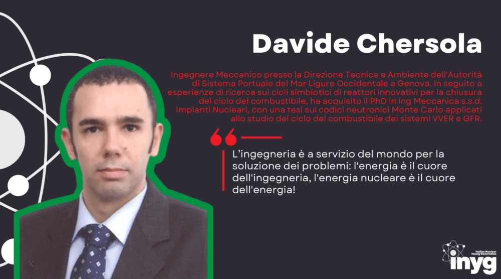 Davide Chersola: Mechanical engineer, currently working in the Direzione Tecnica e Ambiente of the Autorità di Sistema Portuale Del Mar Ligure Occidentale in Genova. He has been a researcher on innovative reactors symbiotic cycles to close the fuel cycle, and he got his PhD in mechanical engineering, nuclear plants, with a thesis on Monte Carlo neutronic codes applied to the study of VVER and GFR fuel cycle.