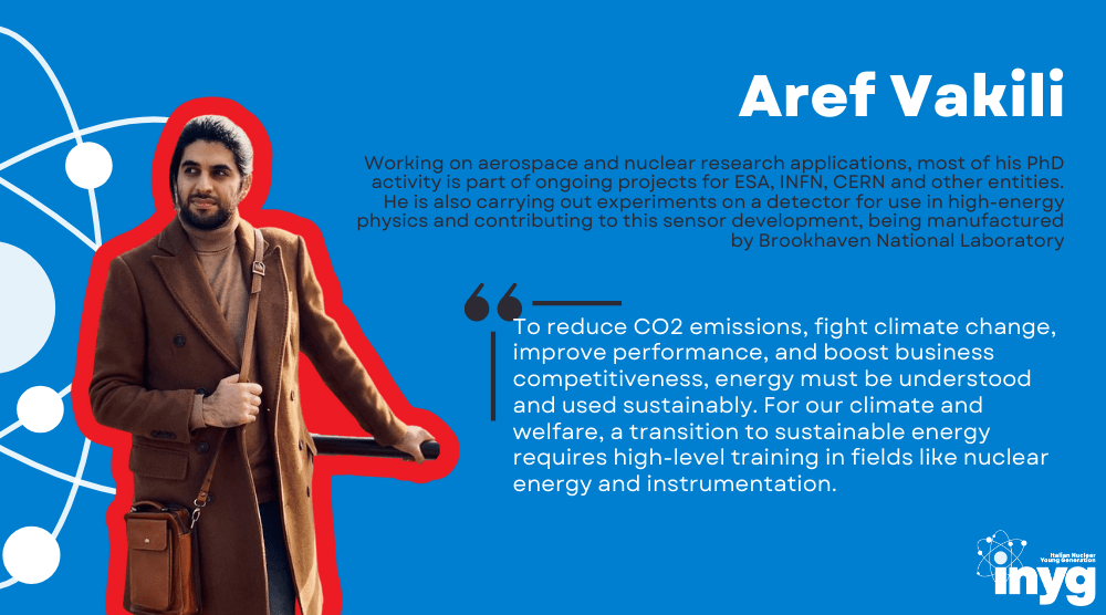 Aref Vakili: a nuclear physicist that is working on aerospace and nuclear research applications. Most of his PhD activity is part of ongoing projects for European Space Agency (ESA), National Institute for Nuclear Physics (INFN), European Organization for Nuclear Research (CERN) and other entities operating in the space and nuclear sectors. He is also carrying out experiments on an important type of detector for use in high-energy physics and contributing to this sensor development, being manufactured by Brookhaven National Laboratory (U.S.).