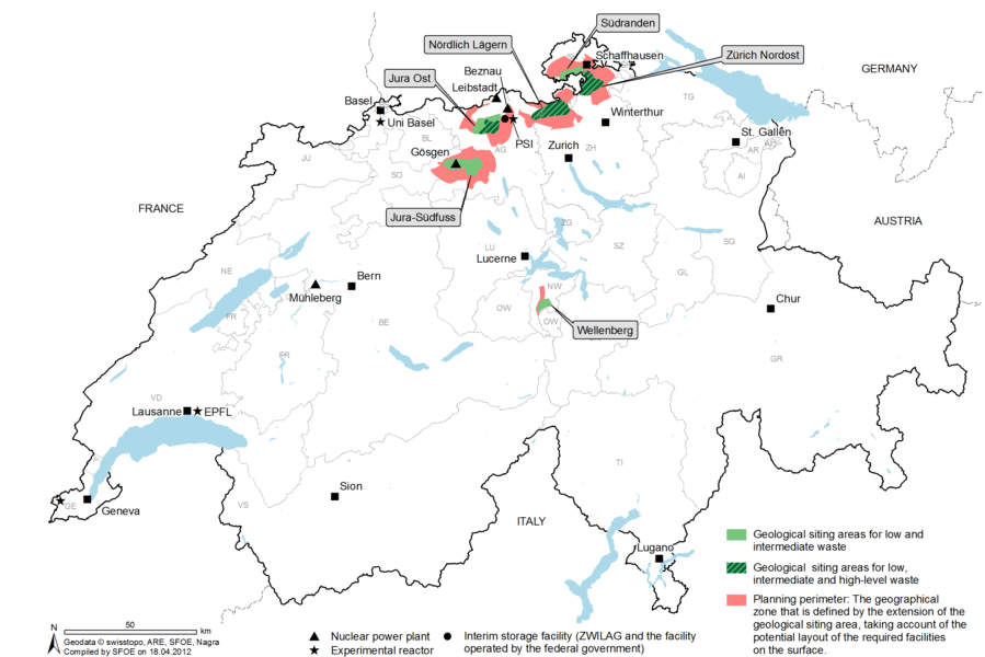 L’iter per la localizzazione di un deposito geologico per i rifiuti radioattivi a media ed alta attività ha preso avvio nel 1972 con la costituzione del consorzio NAGRA, il quale opera dal 1984 un sito sotterraneo sperimentale a Grimsel. In seguito ad una consultazione pubblica lanciata dal Governo federale nel 2012, nel 2015 è stata resa nota la lista dei due possibili siti di localizzazione (Ost Jura e Zurich NordOst), successivamente integrati da un terzo sito tratto dalla lista di riserva. Da allora sono in corso le indagini di dettaglio presso i siti potenziali. NAGRA prevede che il deposito dei rifiuti a media attività divenga operativo nel 2050, quello dei rifiuti ad alta attività un decennio dopo.