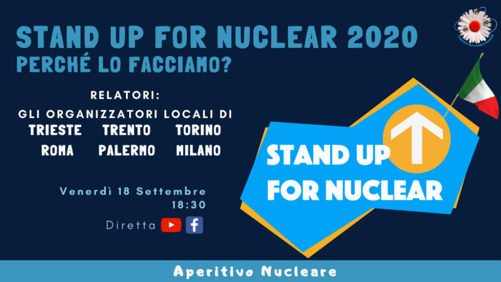 Venerdì 18 settembre alle ore 18.30 un nuovo appuntamento con l’Aperitivo Nucleare del Comitato Nucleare e Ragione, in diretta sui canali social. Il tema della serata saranno i pro e i contro dell’energia nucleare e altre curiosità sulle applicazioni delle tecnologie nucleari, in preparazione dell’evento Stand Up for Nuclear che in Italia si svolgerà il 27 settembre in 6 città (Torino, Milano, Trento, Trieste, Roma e Palermo).