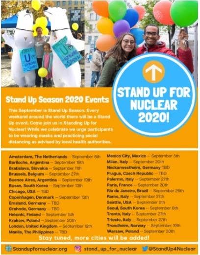 Settembre quest’anno è la stagione delle manifestazioni pro-nucleare. Oltre 40 città sparse per il mondo aderiscono all’evento Stand Up for Nuclear, indetto per il secondo anno consecutivo dalla Nuclear Pride Coalition. In Italia – ben rappresentata nella compagine internazionale – gli “avvocati” del nucleare scenderanno in piazza il 27 settembre a Torino, Milano, Trento, Trieste, Roma e Palermo. Ad aprire le danze sono state – tra il 5 e il 7 settembre scorsi – Seattle (USA), Brokdorf (Germania), Helsinki (Finlandia) e il Messico (con un evento online causa COVID-19).