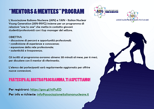 Con simili obiettivi e per dare queste possibilità ai giovani del network italiano, l’ AIN-INYG ha lanciato nel dicembre 2017 un programma di mentoring che si avvarrà dei leader del settore coinvolti nell’Associazione Italiana Nucleare. Il programma è condotto da Eleonora Lambridis – delegata dell’ AIN-INYG per le relazioni con la European Nuclear Society – Young Generation Network (ENS-YGN). Per gli interessati è possibile registrarsi tramite un’apposita pagina Web (qui).