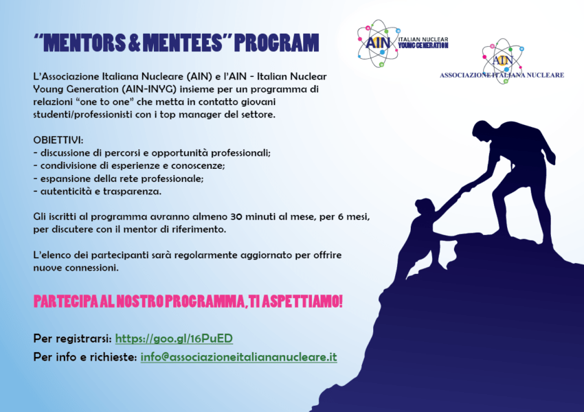 Con simili obiettivi e per dare queste possibilità ai giovani del network italiano, l’ AIN-INYG ha lanciato nel dicembre 2017 un programma di mentoring che si avvarrà dei leader del settore coinvolti nell’Associazione Italiana Nucleare. Il programma è condotto da Eleonora Lambridis – delegata dell’ AIN-INYG per le relazioni con la European Nuclear Society – Young Generation Network (ENS-YGN). Per gli interessati è possibile registrarsi tramite un’apposita pagina Web (qui).