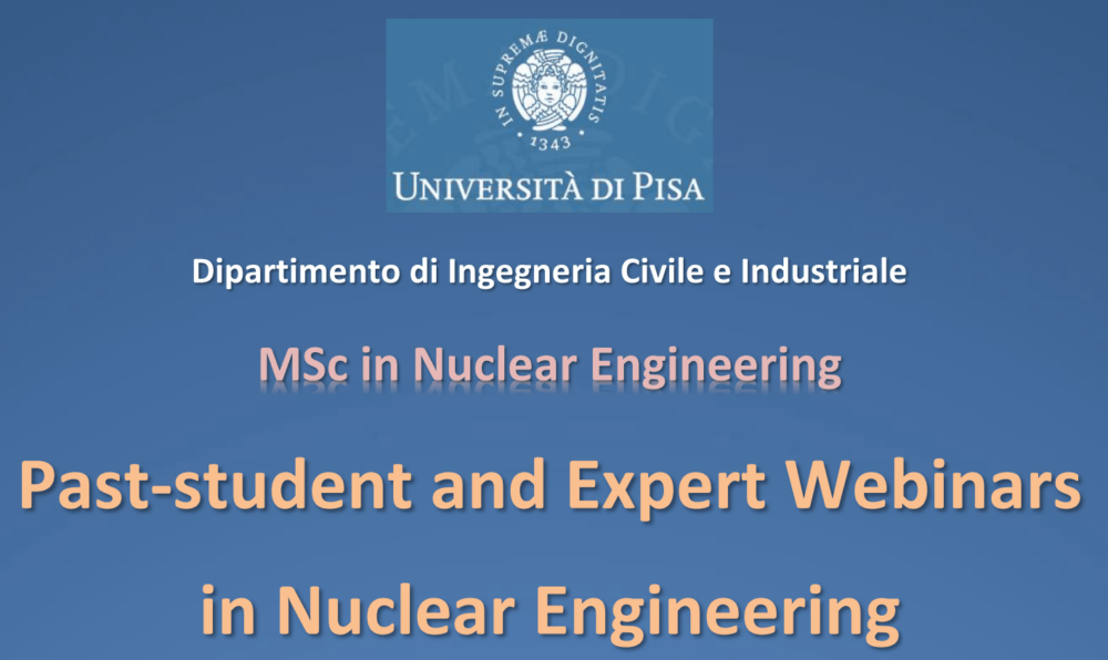 Per la serie Past-students and Expert Webinars in Nuclear Engineering propmossi dal Corso di laurea in Ingegneria Nucleare dell’Università di Pisa, segnaliamo i seguenti appuntamenti della seconda metà di marzo: